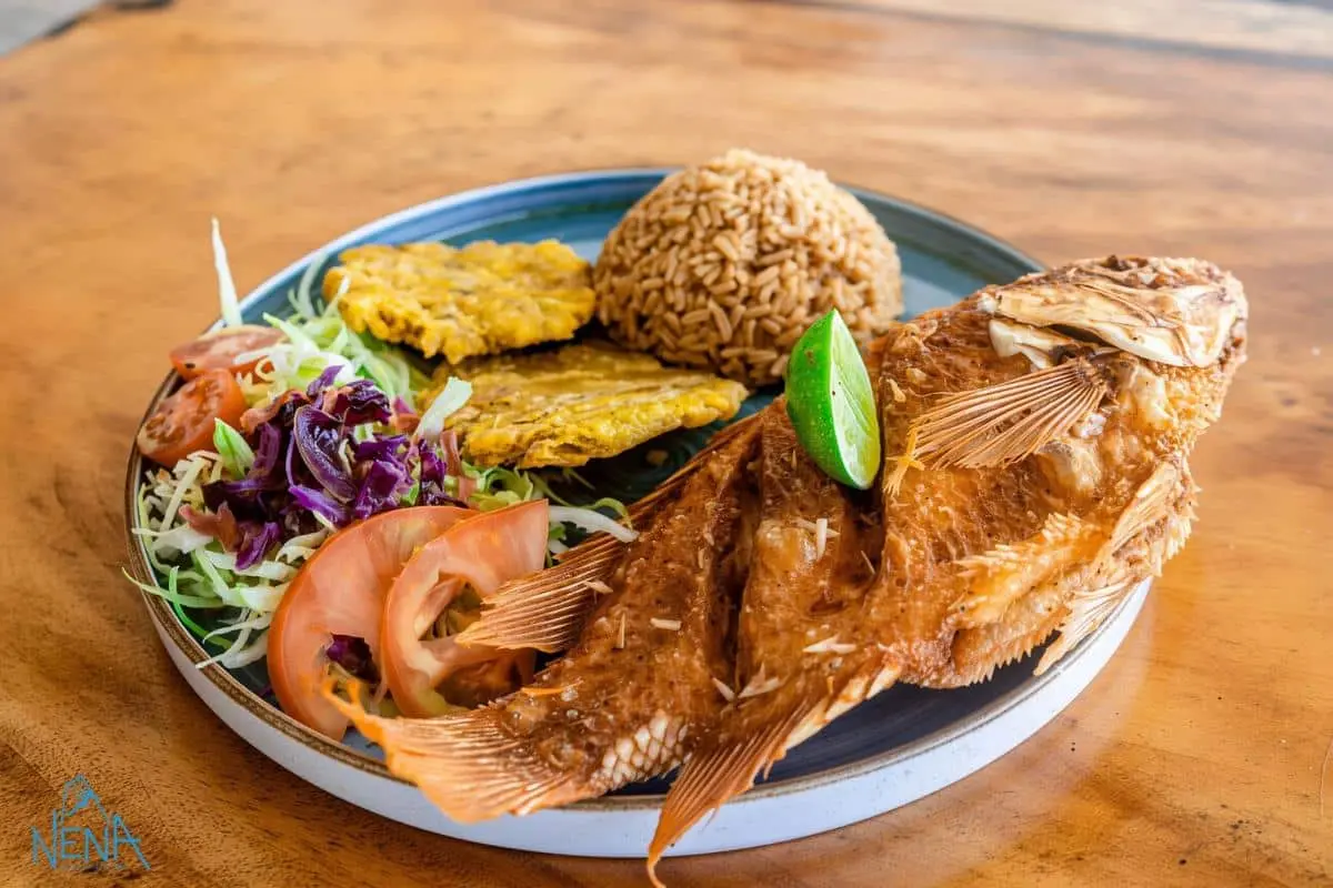 La experiencia gastronómica permite elegir entre pescado, pechuga de pollo, arroz de camarones o una opción vegetariana, acompañados de café para cerrar el almuerzo.